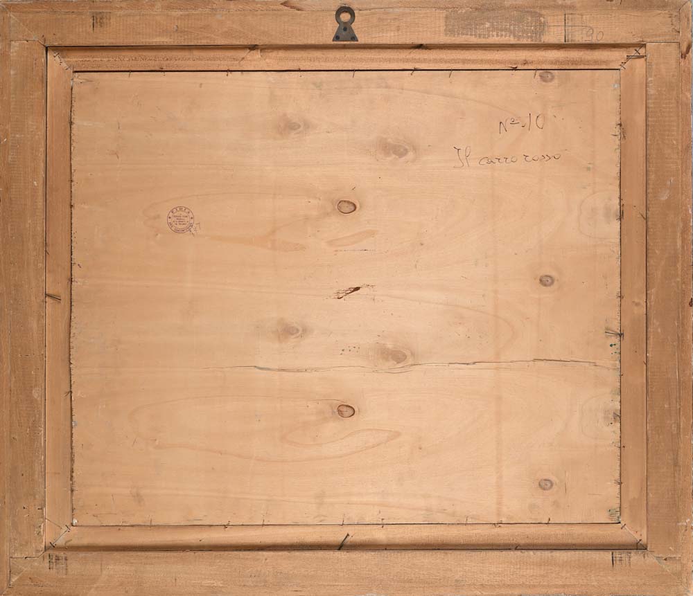 Il carro rosso 1970 Firma e data in basso a destra "Ceracchini 1970". Al verso reca timbro della "Galleria d'Arte Fidia, Roma" e titolo Olio su tavola cm 70x84 - in cornice cm 92x106