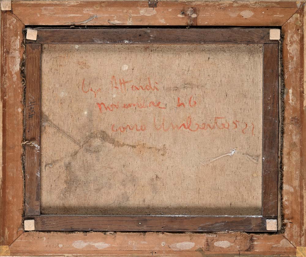 Natura morta 1946 Firma in basso a sinistra "U. Attardi". Al verso Ugo Attardi, Novembre '46, Corso Umberto 522". Olio su tela cm 40x50 - in cornice cm 53x63