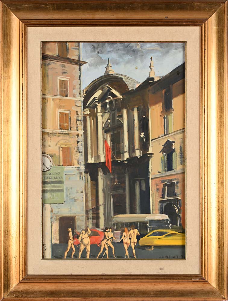Veduta di Roma con Chiesa, automobili e nudi di figure 1968 Firma e data in basso a destra "Aldo Pagliacci '968" Olio su tela cm 60x40 - in cornice cm 81x61