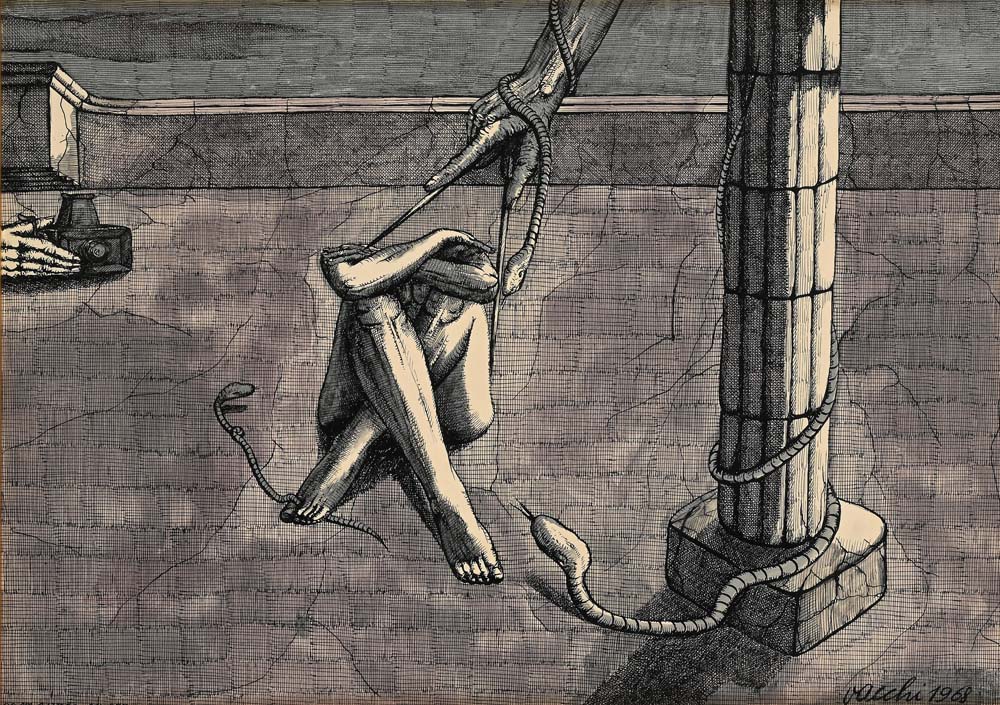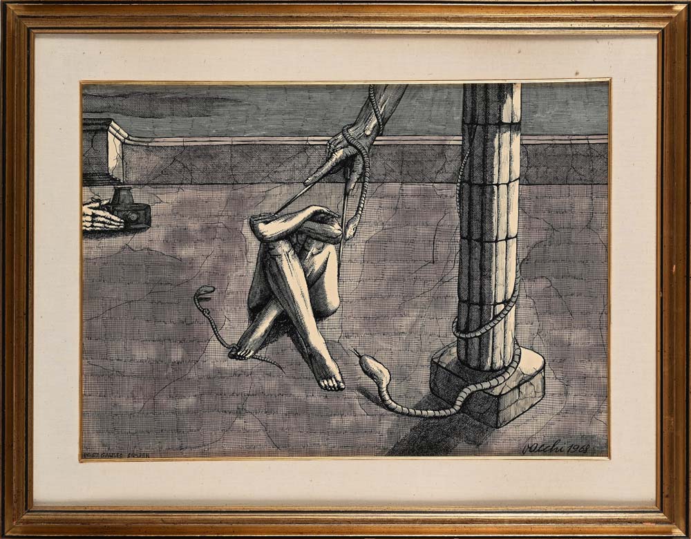 Post Galileo Semper 1968 Firma, data e titolo in basso "Vacchi 1968". Inchiostro e argento su carta cm 48x68 - in cornice cm 70x90