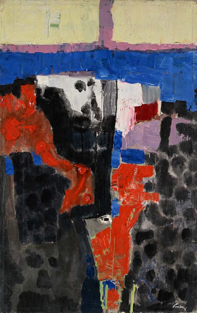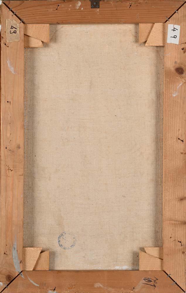 Composizione astratta Firma in basso a destra "Paulucci". Al verso timbro di galleria non leggibile (probabilmente Galleria d'Arte del Vantaggio, Roma" Olio su tela cm 55,5x35,5