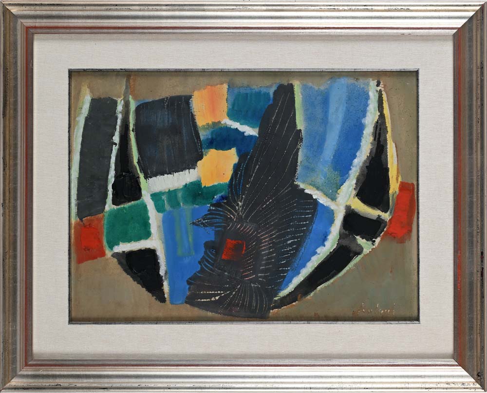 Composizione astratta Firma in basso a destra "Paulucci". Al verso reca timbro non leggibile, probabilmente della Galleria d'Arte il Vantaggio, Roma Tempera, acquarello e strappi su carta applicata su tela cm 37x50 - in cornice cm 55x69