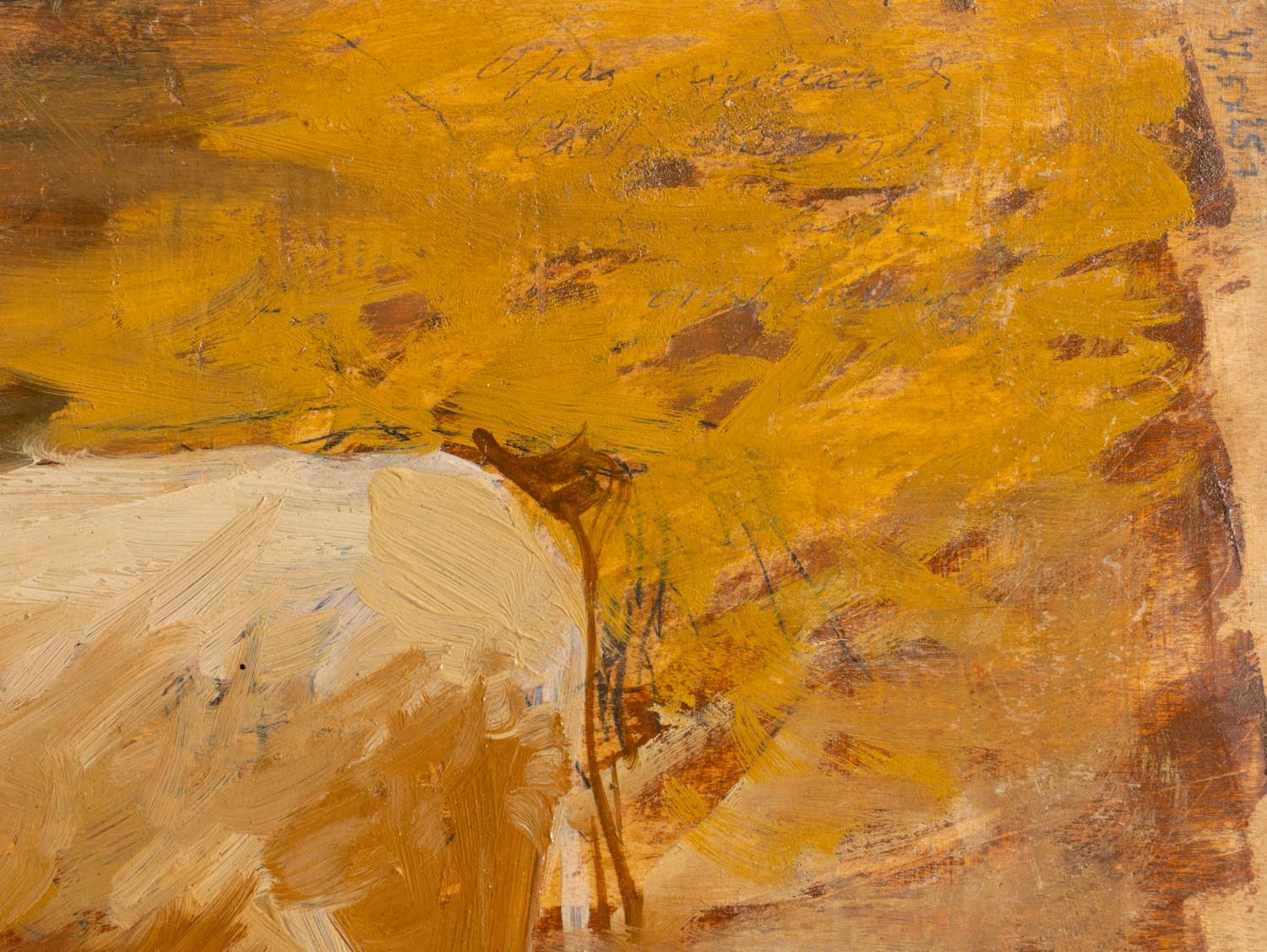 Olio su tavoletta rectoverso, reca firma in basso a destra, al retro reca autentica in alto a destra, H cm 26x37,5