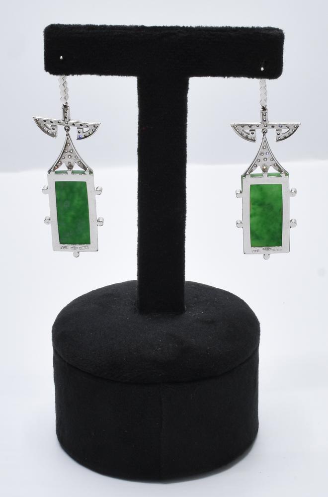 Elegant pair of earrings in 18K white gold featuring brilliant-cut diamonds and jade. Showcasing remarkable artisanal craftsmanship.Weight: gr. 15