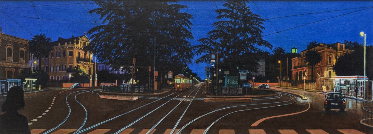 Olio su tela 45 x 120 cm. Al retro firmato, titolato e datato: "Sergio Ceccotti 'Piazza Galeno, sera d'estate' 2004". In cornice.