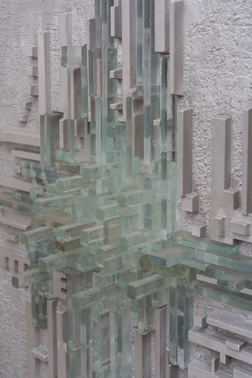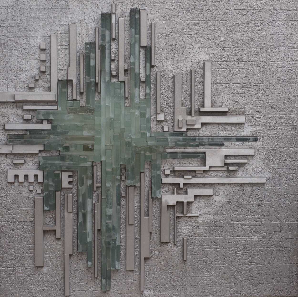 cemento, cristallo grezzo e alluminio 99 x 99 x 16 cm. Produzione Poliarte, Verona. Pannello scultoreo luminoso.