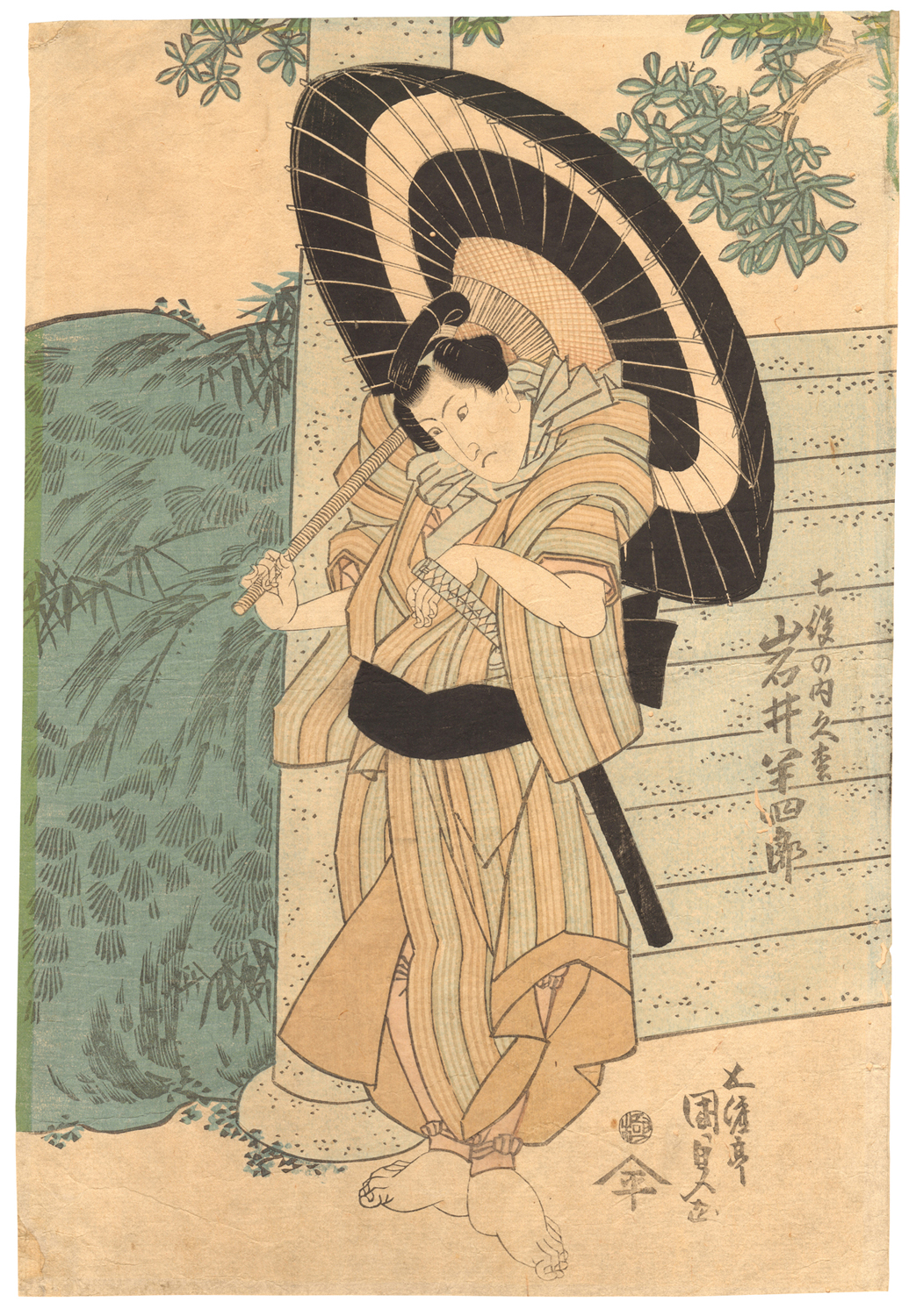 La stampa ritrae il famoso attore Iwai Hanshirō V, discendente di un'antica famiglia di attori Kabuki del periodo Edo. Hanshirō, interprete molto versatile, viene qui rappresentato nelle vesti di un samurai con spada e ombrello.