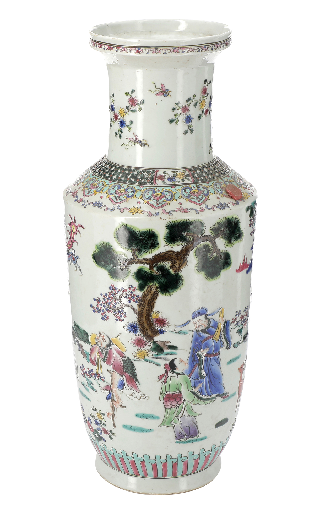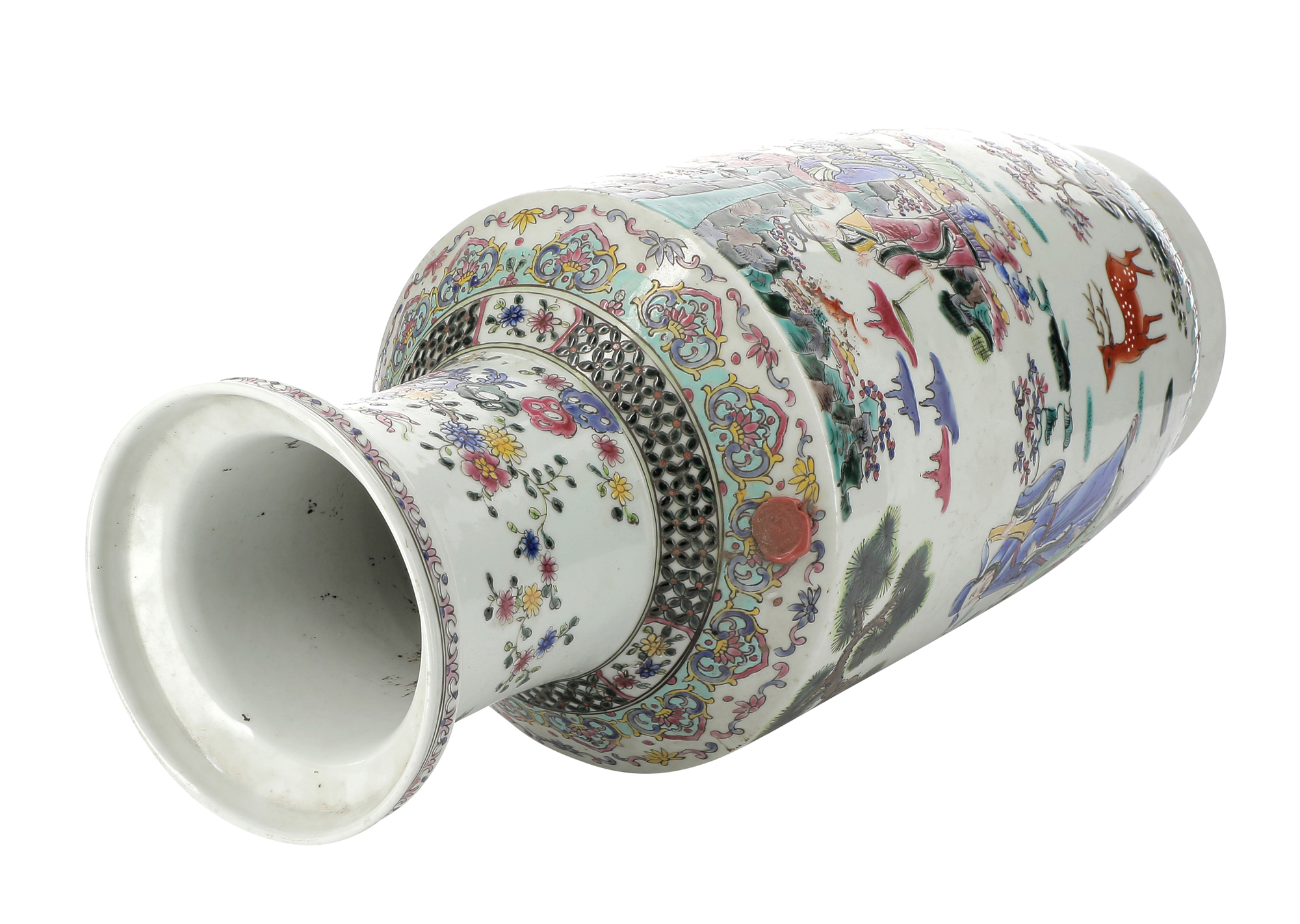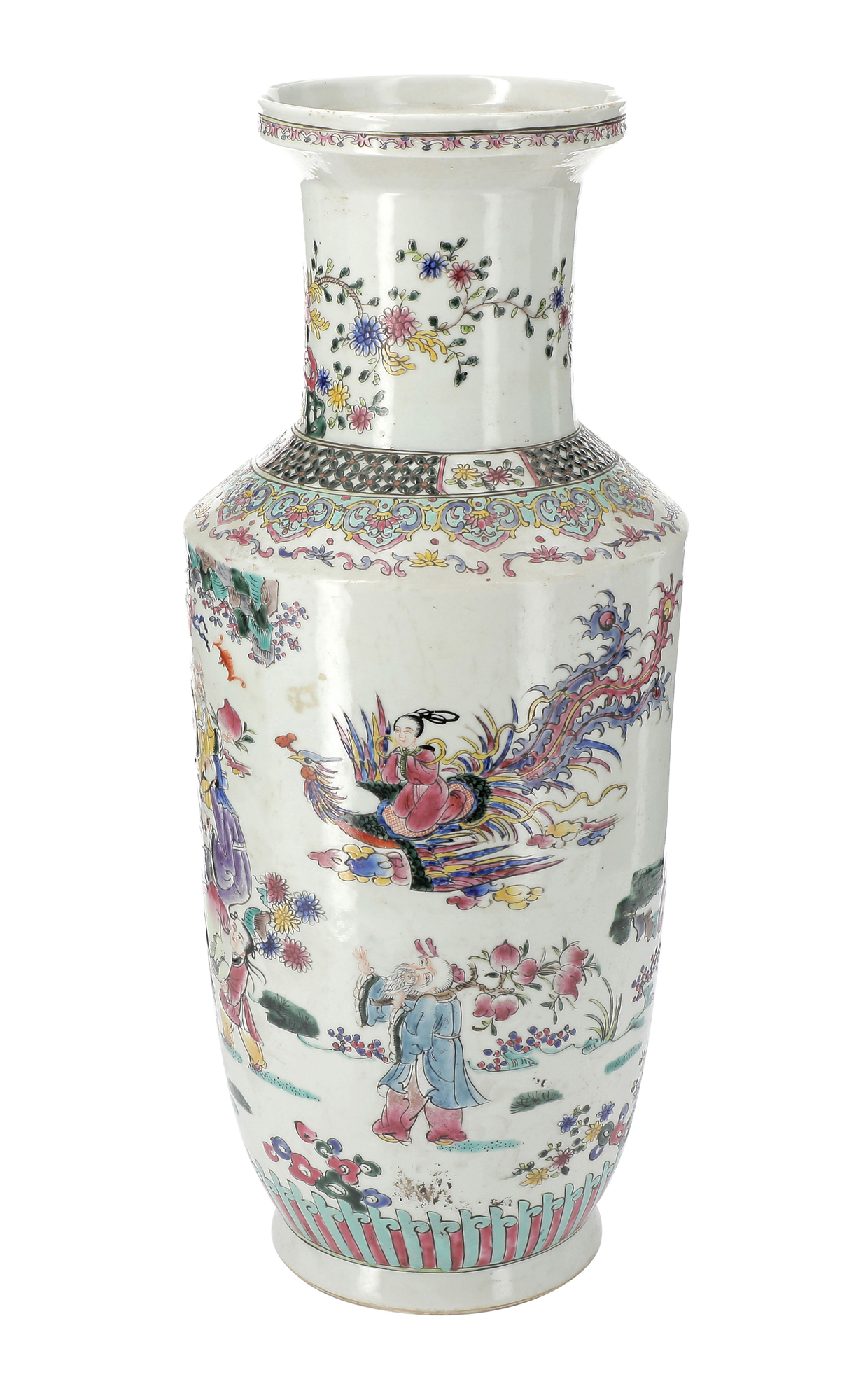 Il vaso illustra un tema centrale nella cultura figurativa taoista: il banchetto degli immortali. La Regina madre di Occidente, Xiwangmu, periodicamente invitava al banchetto le divinità immortali per offrire loro la pesca che avrebbe donato la vita eterna: qui appare trasportata da due assistenti, in bella evidenza, sul primo piano di fronte al banchetto. Molto ricco l’apparato decorativo, con incontri tra gli immortali, Xiwangmu in volo sulla fenice, il cervo, benaugurante l’immortalità, ed il pino simbolo di longevità.