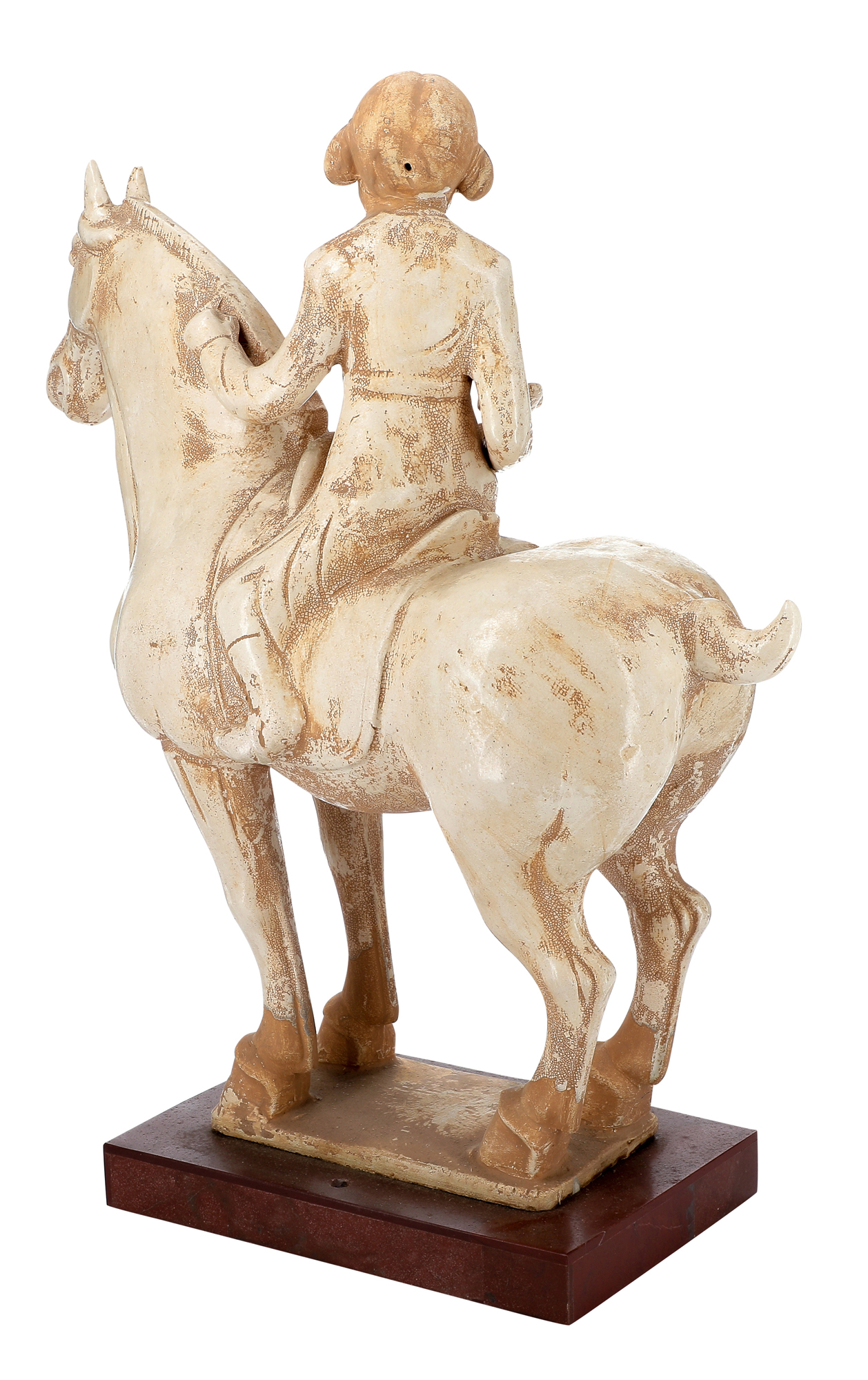 Amazzone con falco in terracotta caolinica con sottile vetrina, il lotto segue le movenze dello stile Tang del VII secolo. Come segnala Roberto Ciarla in base all'esame di foto ad alta definizione, le incrostazioni marroni e la crettatura a maglie molto nette e regolari suggeriscono che si tratti di una replica moderna, realizzata nel XX secolo (comunicazione del 2 novembre 2021).