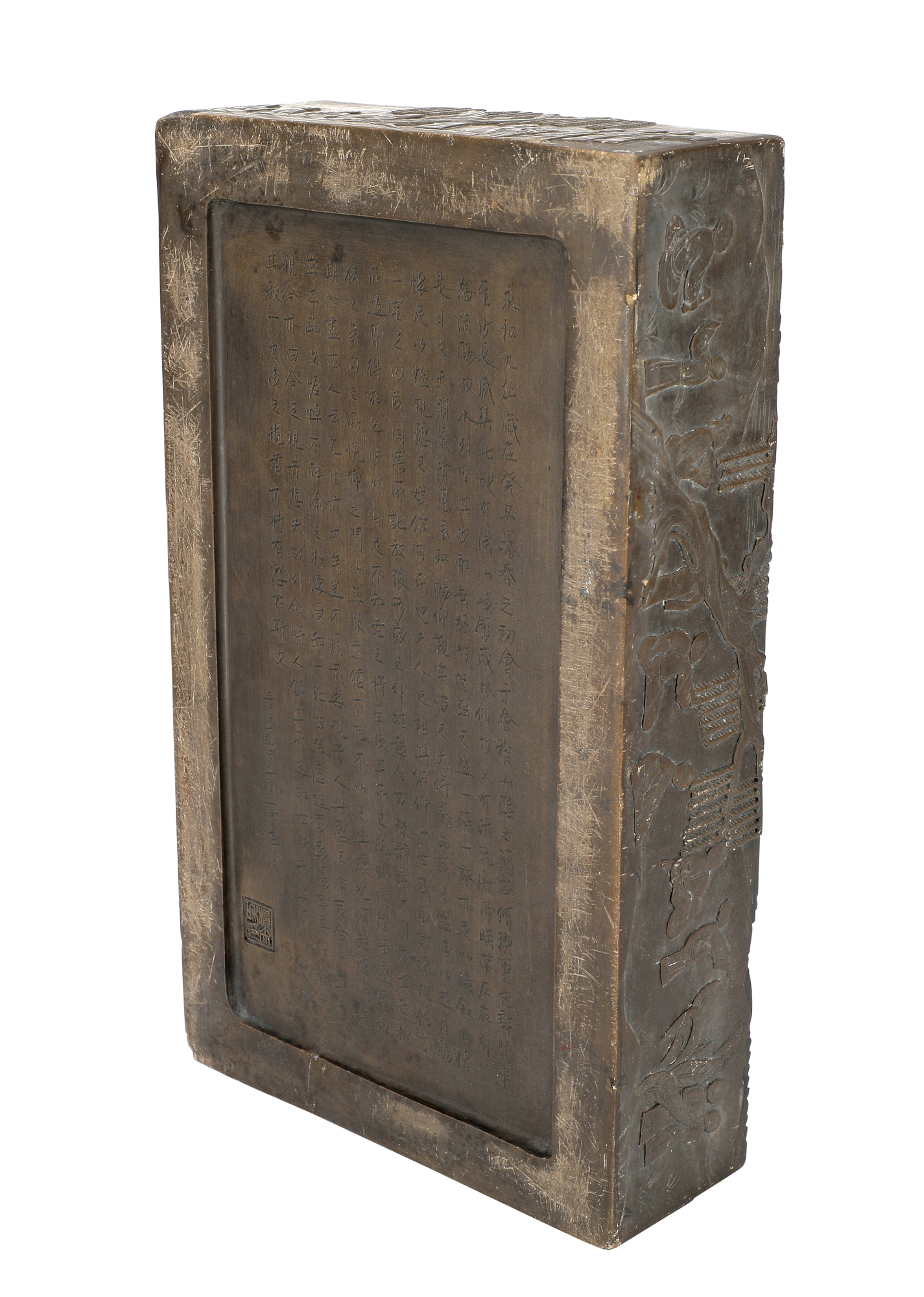 La bella pietra da studio, di peso inusitato perché possa essere essere trasportata, è illustrata da scene di incontri tra letterati nel paesaggio. In prima facciata, contenuta tra elementi architettonici, si vede probabilmente il proprietario, al banco di lavoro, con unione dell’elemento umano e di quello naturale, grazie ad una scala che porta al lago in cui egli deporrà l’inchiostro. Sui lati, scene di letterati nel paesaggio in maggiore o minore distanza e sul verso una lunga composizione in caratteri, di tema colto, chiusa da sigillo.