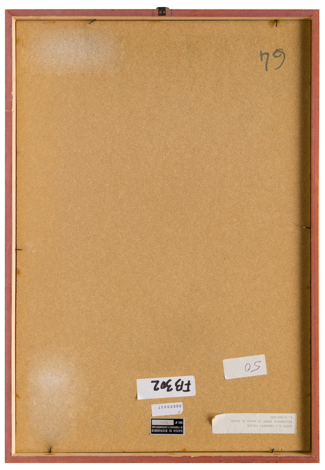 Elementi distintivi: timbro a secco dello "ATELIER CASORATI" al recto; sul verso, etichetta anonima con dati dell'opera; etichetta Cassa di Risparmio di Fabriano e Cupramontana con riferimenti di inventario