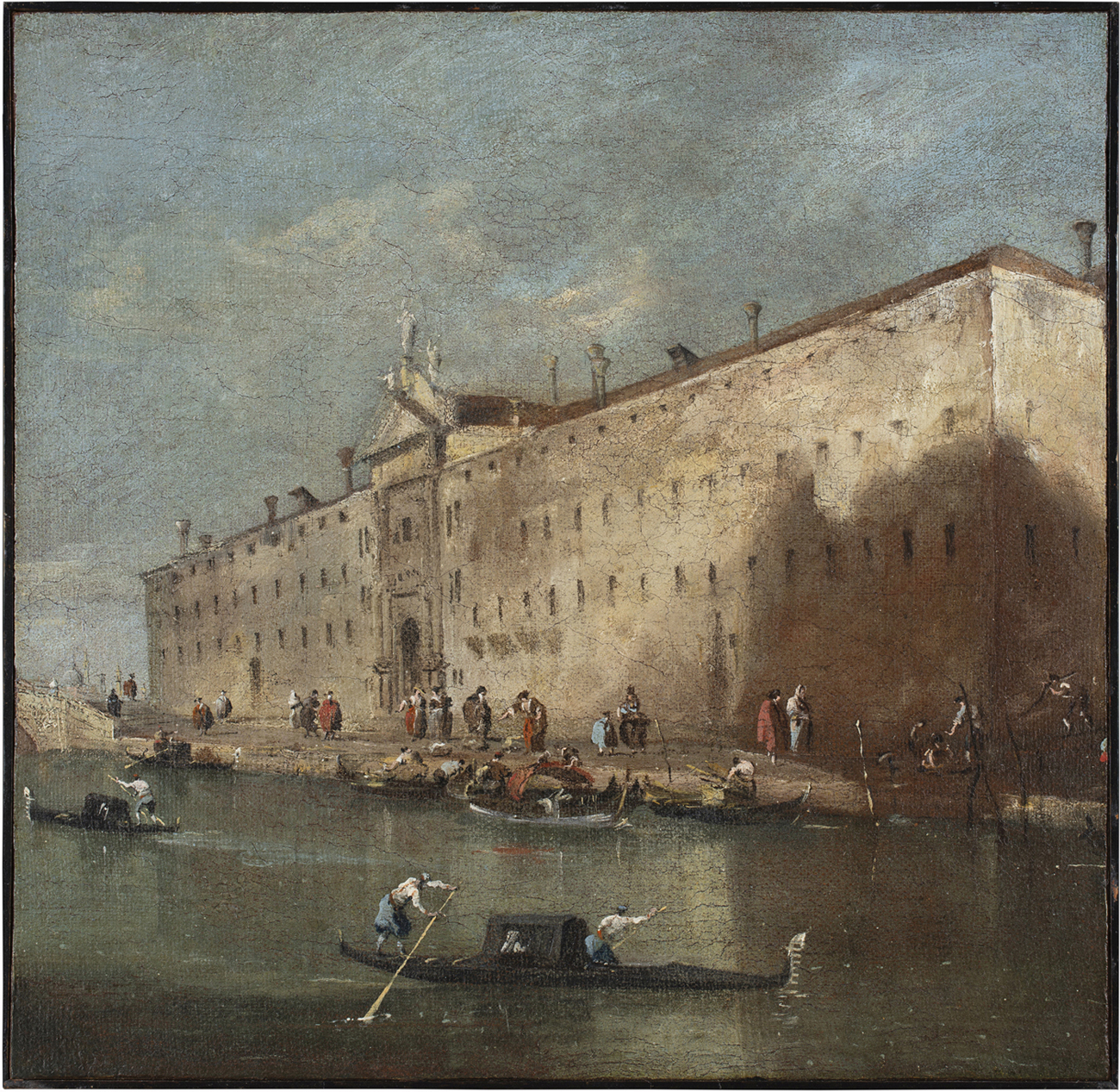 Come osserva Antonio Morassi, le "vedute" costituiscono la parte predominante, se non proprio esclusiva, dell'attività pittorica di Francesco Guardi dopo il 1760 e particolarmente nei suoi ultimi due decenni di vita (Morassi 1973, I, pp. 245-247). Il Rio dei Mendicanti al Convento dei Domenicani è affrontato da Guardi in almeno cinque versioni autografe (Morassi, 1973, II, catt. 609-613; cat. 614, tela conservata al Museo di Digione, è stata recentemente espunta), simili tra loro e tutte osservate dallo stesso punto di vista, cioè dalla riva sinistra del canale che divide Cannaregio e Castello, guardando la laguna in distanza. Di esse la tela già in collezione Peralta Ramos (cat. 609), costituisce forse il prototipo, databile intorno al 1760. Come sottolinea Dario Succi nella scheda per la mostra "Canaletto. Venezia e i suoi splendori", nella versione di Veneto Banca in LCA, il pittore rinuncia al ponte sullo sfondo, così accentuando il complesso architettonico dell'ospizio di San Lazzaro dei Mendicanti, uno dei principali ospedali di Venezia, con la chiesa collocata al centro di due lunghe ali i cui corpi, ultimati nel 1631, si articolano intorno a due chiostri ed alla facciata della chiesa, ultimata nel 1673 da Giuseppe Sardi completando un progetto di Vincenzo Scamozzi.