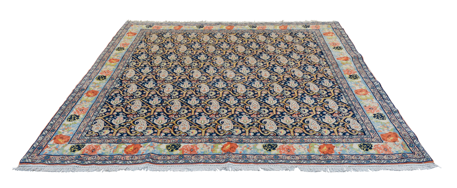 Il campo a boteh su fondo blu, la bordura a fondo azzurro chiaro con rose del tipo gol farang o rosa francese.