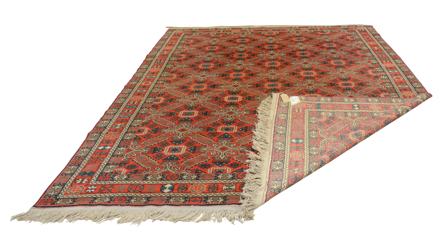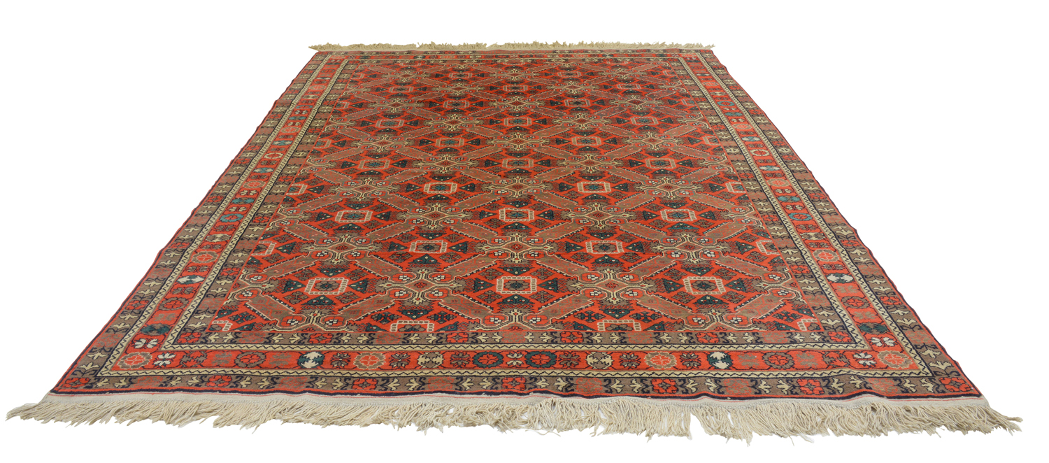Insolito tappeto caucasico con il motivo a croce di Sant’Andrea tipico dei tappeti Seikhur dell’area di Quba in Azerbaigian ma prodotto in Dagestan come risulta chiaramente dall’iscrizione intessuta.