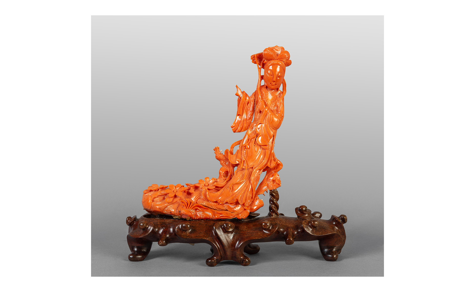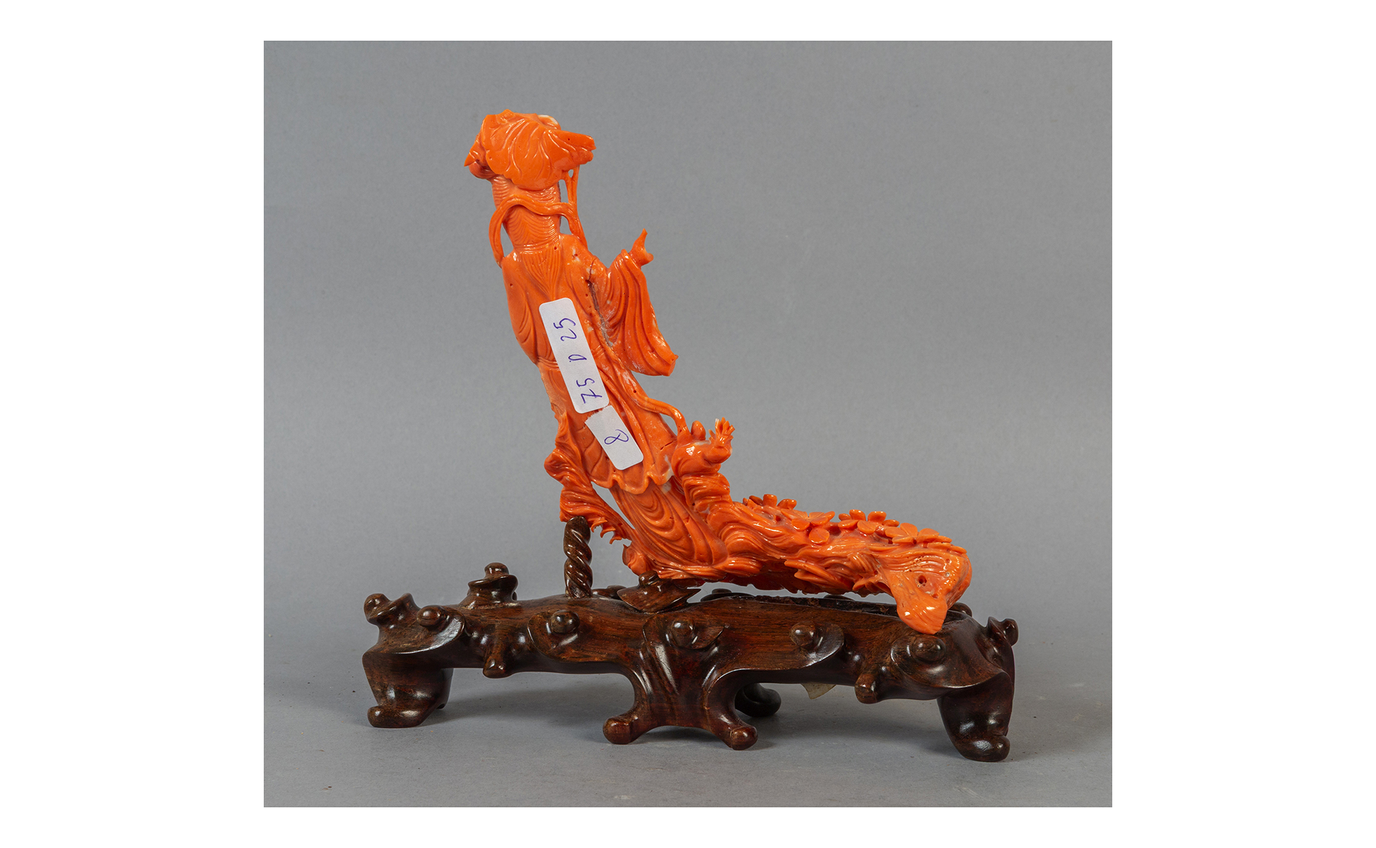Scultura in corallo raffigurante guanin poggiante su base in legno