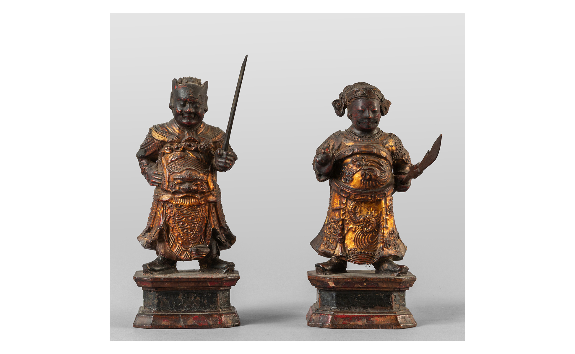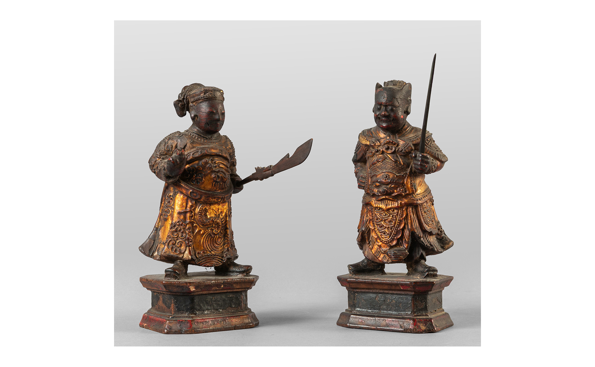 Guerrieri coppia di sculture in legno intagliato e dorato Cina sec.XIX