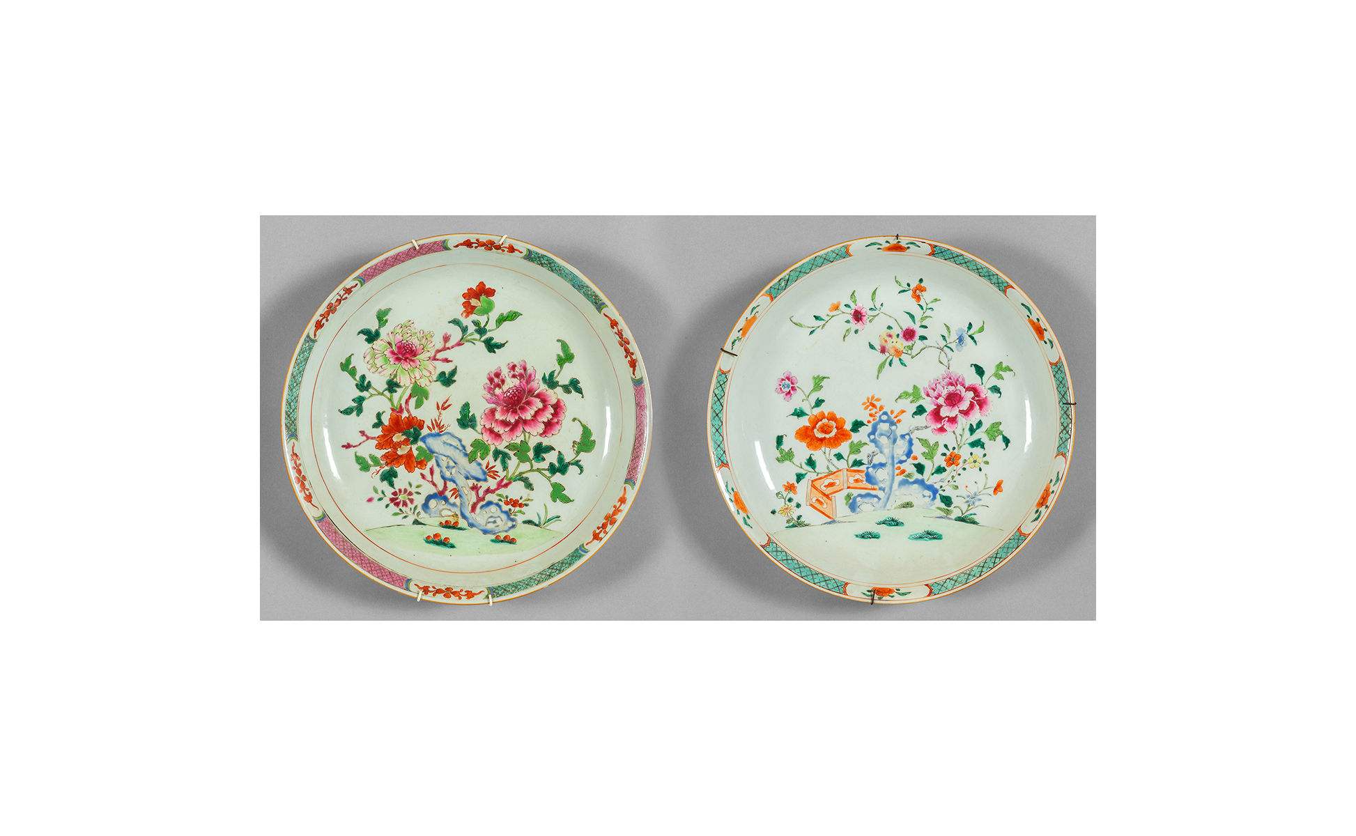 Due piatti in porcellana policroma famiglia verde Cina sec.XVIII
