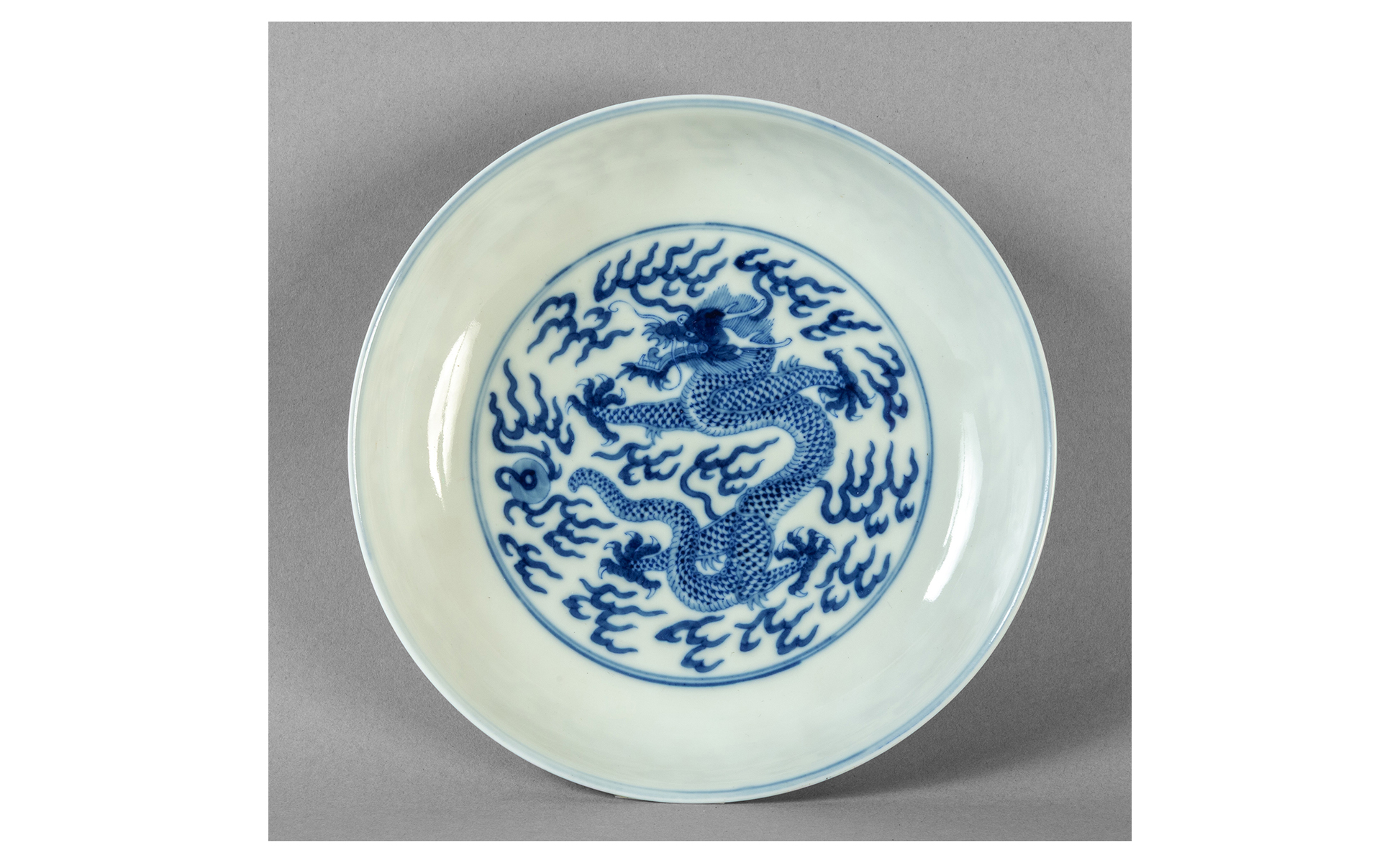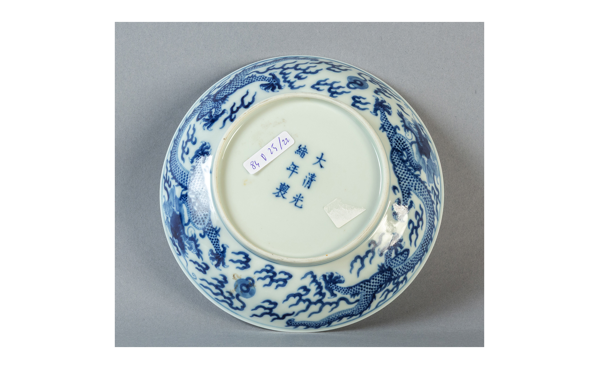 Piatto in porcellana bianco e blu con decoro di drago marcato alla base Cina