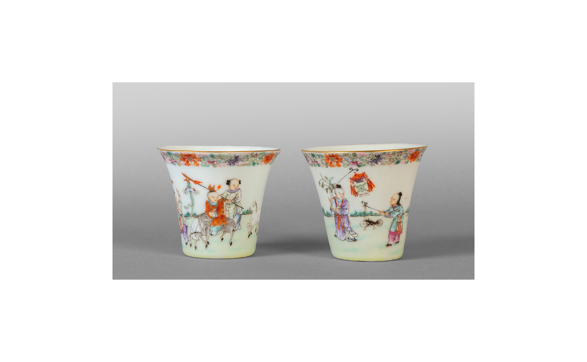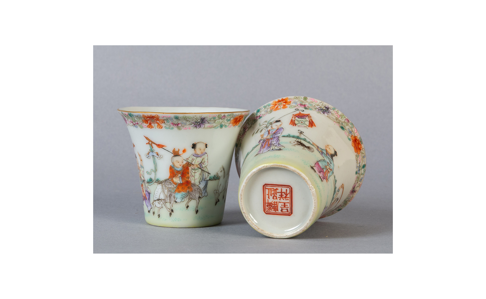 Coppia di tazzine in porcellana famiglia rosa decorate con figure di bambini marcate alla base Cina sec.XIX