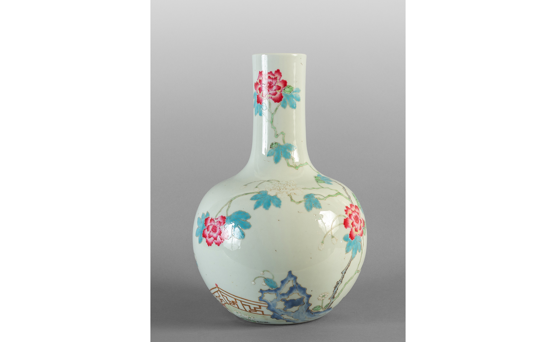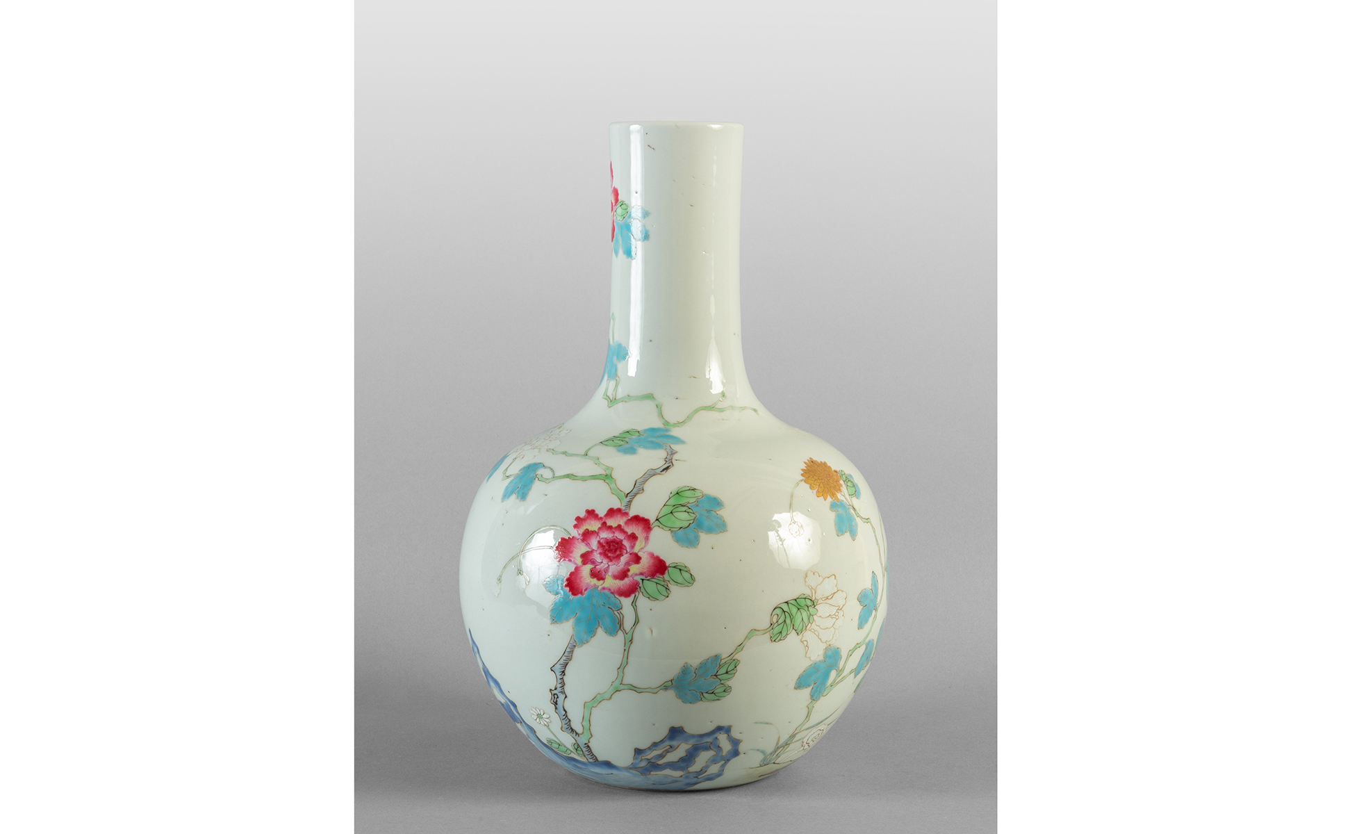 Vaso a collo lungo in porcellana famiglia rosa decorato a fiori in policromia ed oro Cina sec. XIX