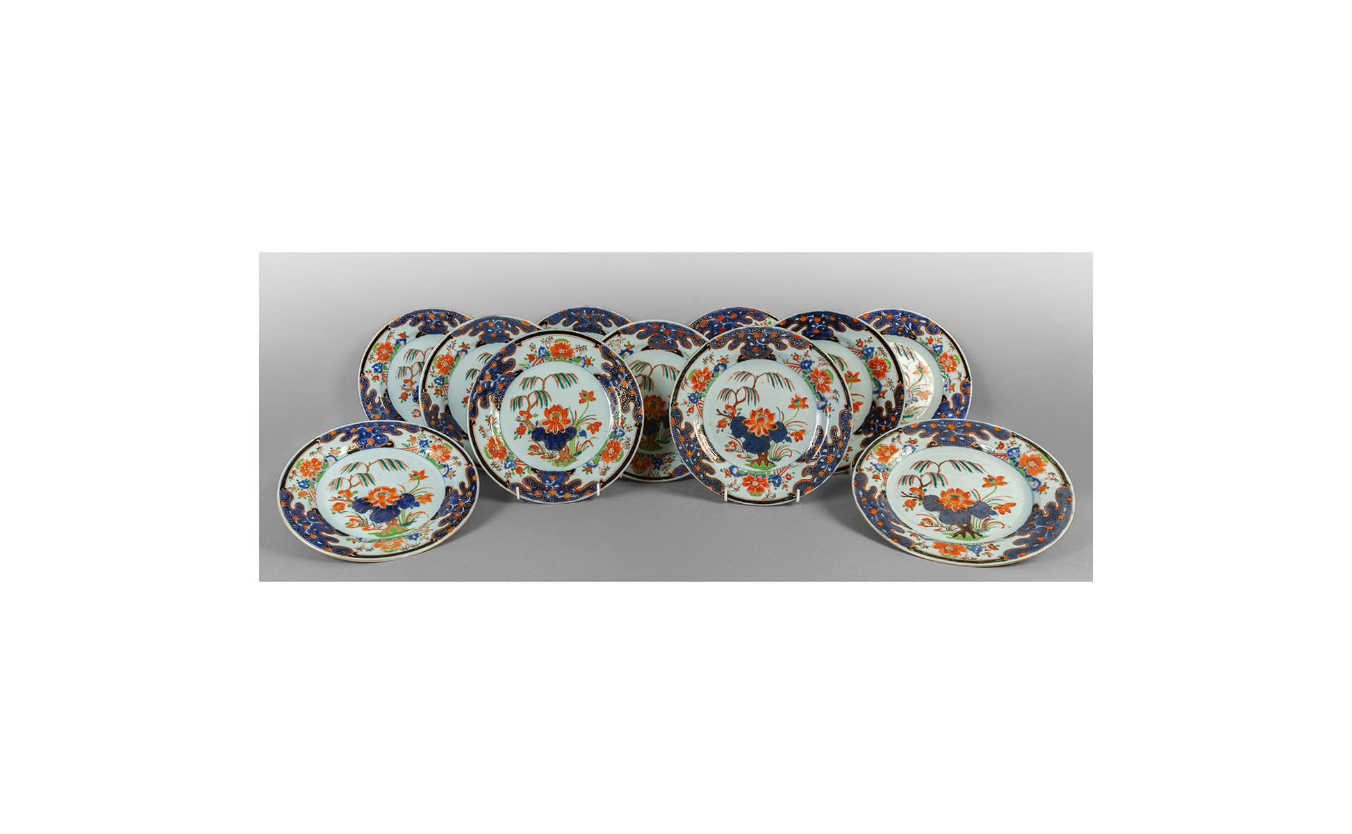 Undici piatti in porcellana Compagnia delle Indie decorati in policromia con il garofano sec.XVIII