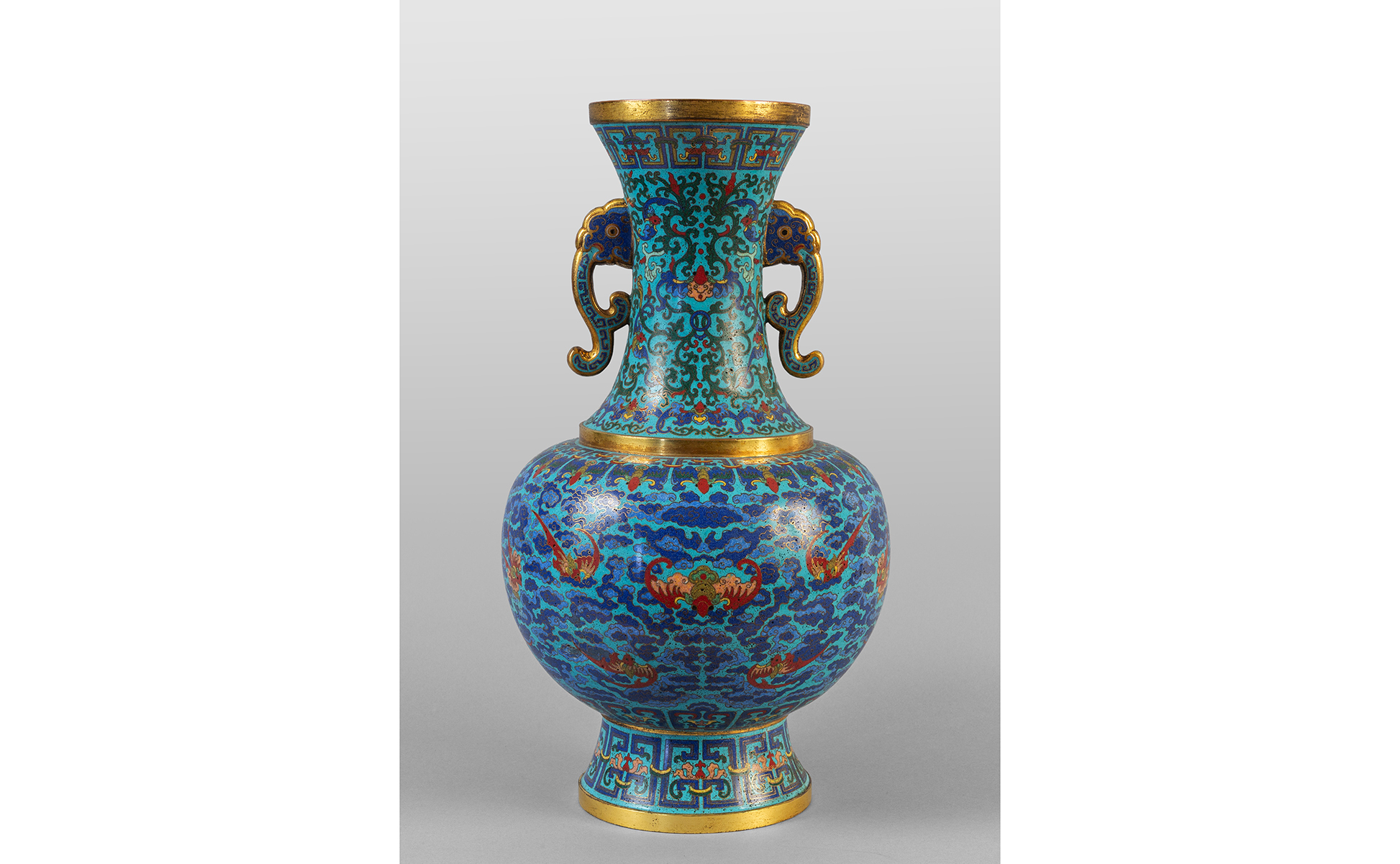 Vaso in bronzo cloisonnè decorato a motivi di pipistrelli e nuvole marcato alla base Cina