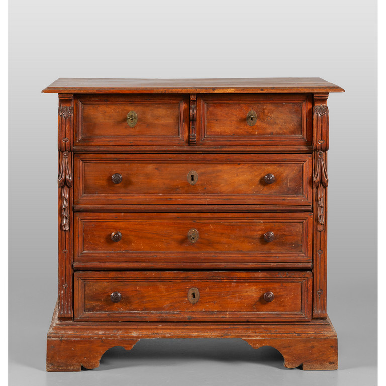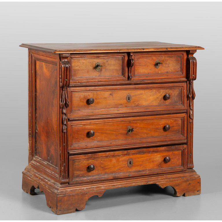 Piccolo comò a tre cassetti più due cassettini lesene scolpite a festoni barocchi Liguria sec.XVII