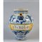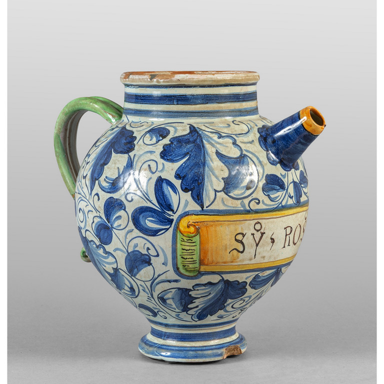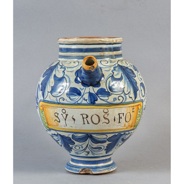Versatoio in ceramica decorato a foglie blu scritta medicinale Italia Centrale sec.XIX