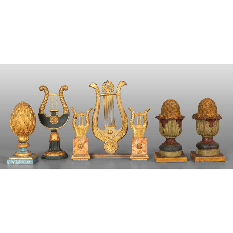 Collezione di lire e pigne in legno intagliato e laccato sec.XIX