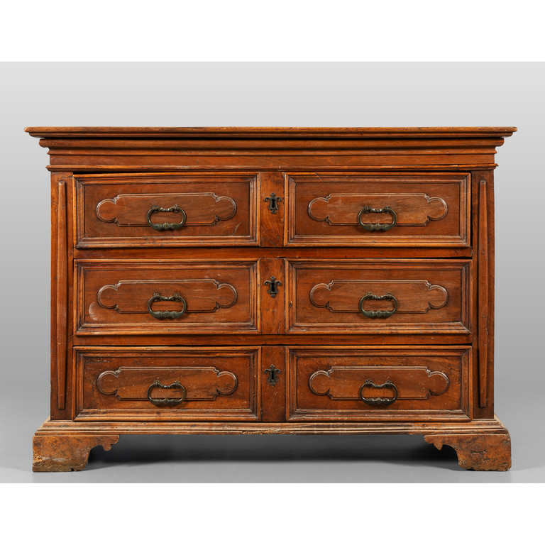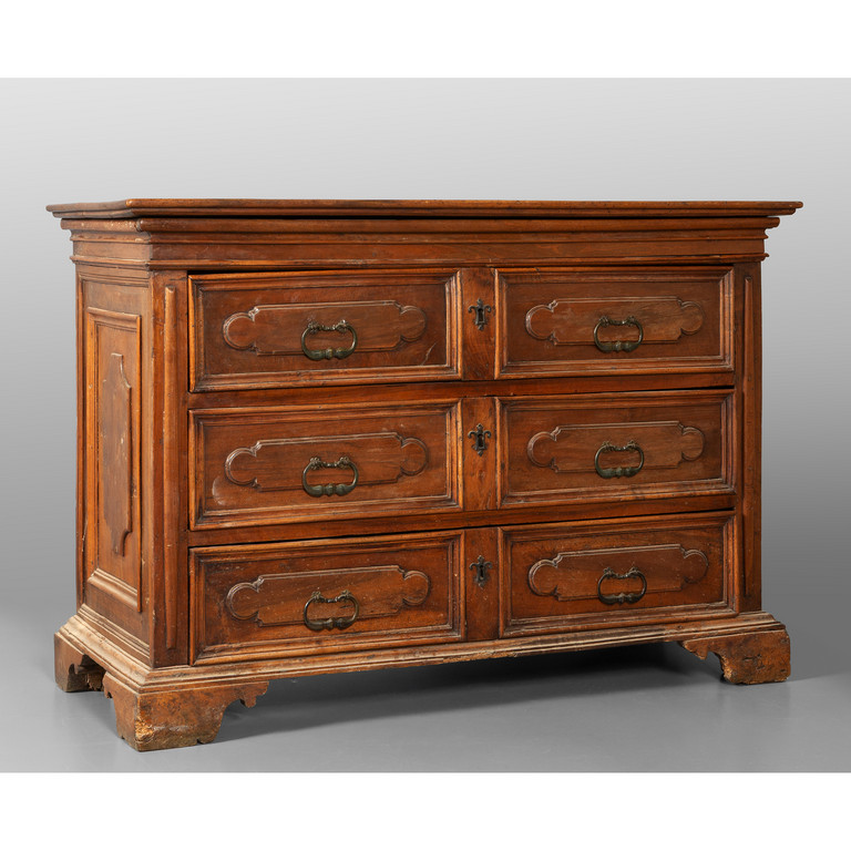 Comò Luigi XIV a tre cassetti e cassettino sottopiano in noce finemente intagliato sul fronte e sui fianchi Emilia sec.XVIII
