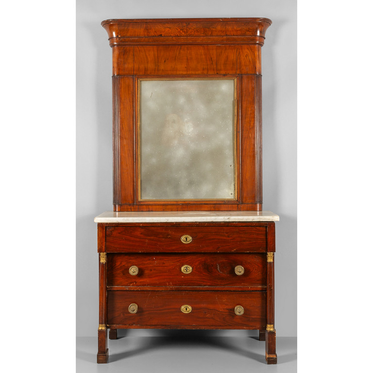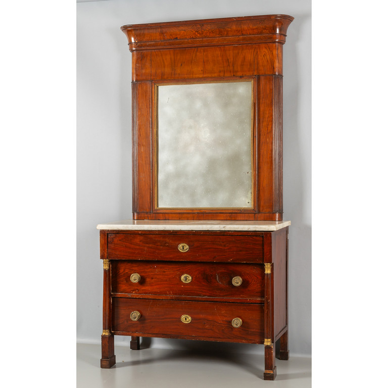 Comò Impero a due cassetti più uno sul fronte colonnine con capitelli in legno intagliato e dorato piano in marmo con specchiera analoga