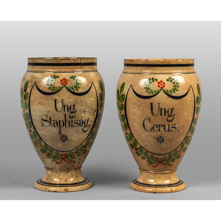 Coppia di albarelli in ceramica decorati in policromia con scritta medicinale Italia Centrale sec.XIX