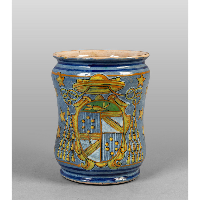 Albarello in ceramica decorato con stemma nobiliare in policromia Italia centrale sec.XIX