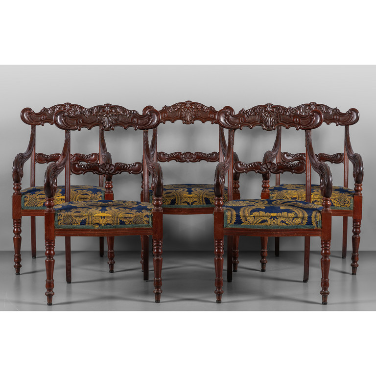 Cinque poltrone Carlo X in mogano sec.XIX (più una con schienale rotto)