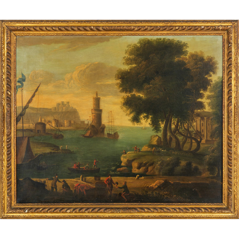 Scuola piemontese sec.XVIII 'Paesaggio marino con faro' olio