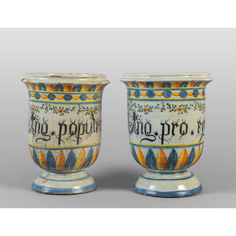 Coppia di albarelli in ceramica decorati in policromia con scritte medicinali Italia Meridionale sec.XIX