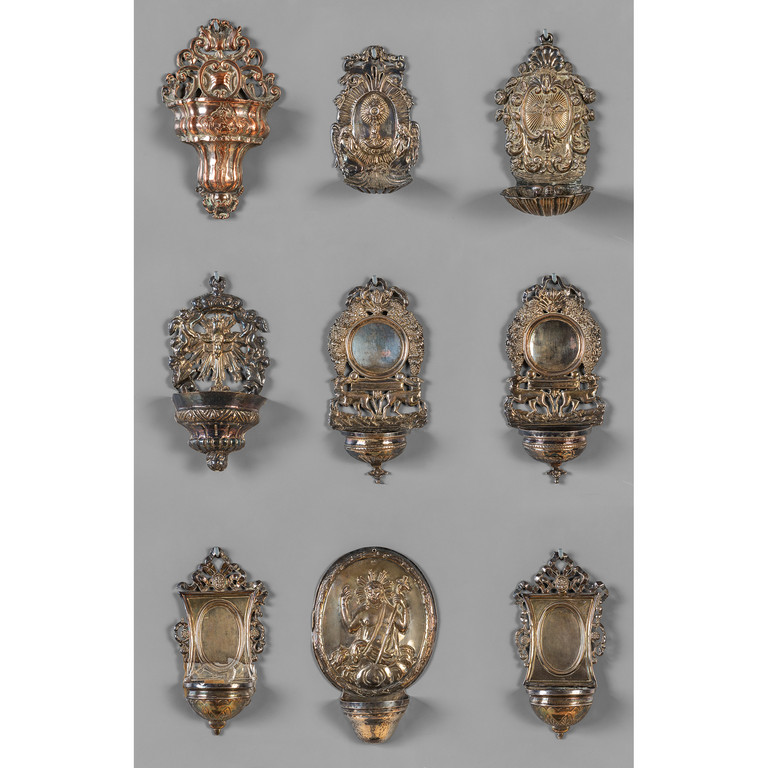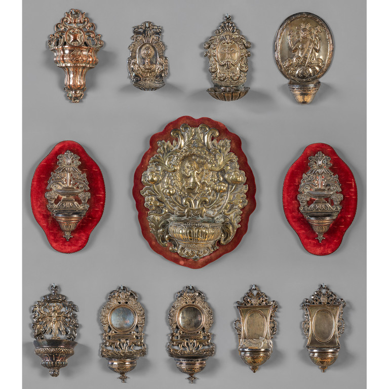Dodici acquasantiere di varie epoche e misure in argento e rame argentato sec.XVIII e XIX