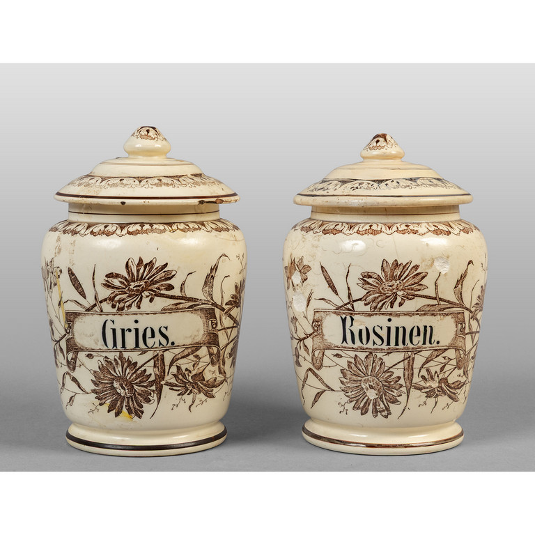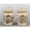 Coppia di albarelli con coperchio in ceramica decorati a fiori in manganese con scritta medicinale sec.XIX