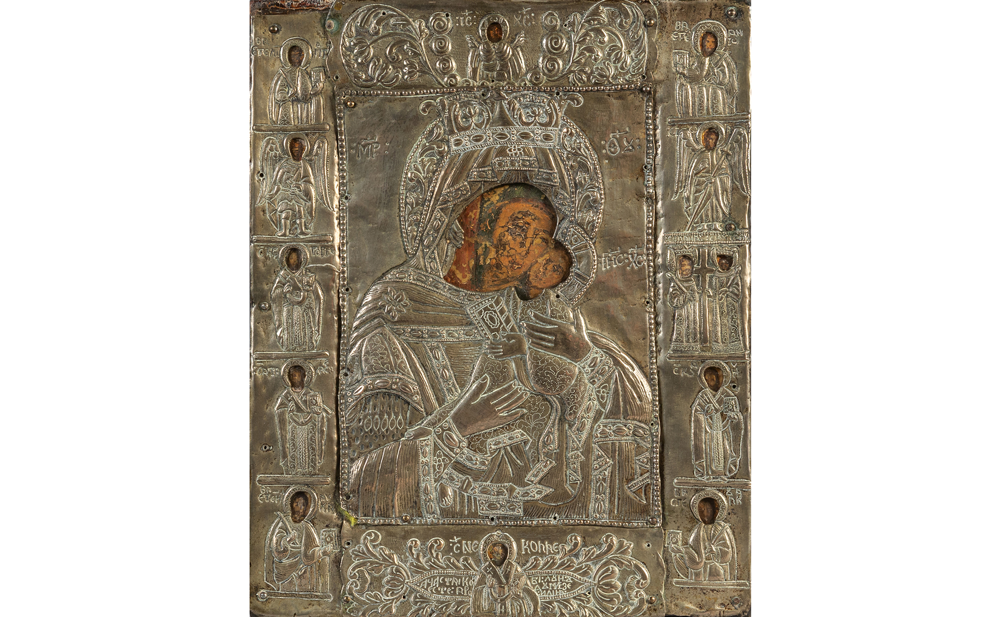 'Madonna con Bambino' icona con riza in metallo sbalzato Russia sec.XIX