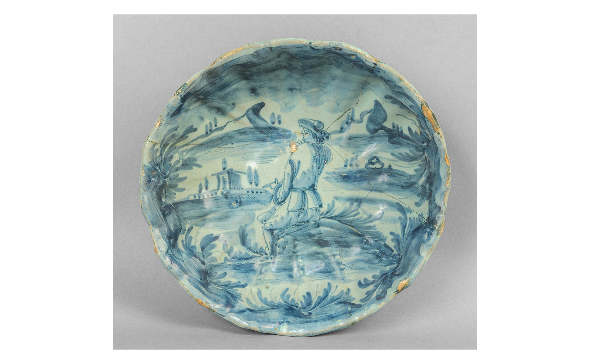 Catino in ceramica decorato con personaggi in blu su fondo berrettino marca Stemma Savona sec.XVIII
