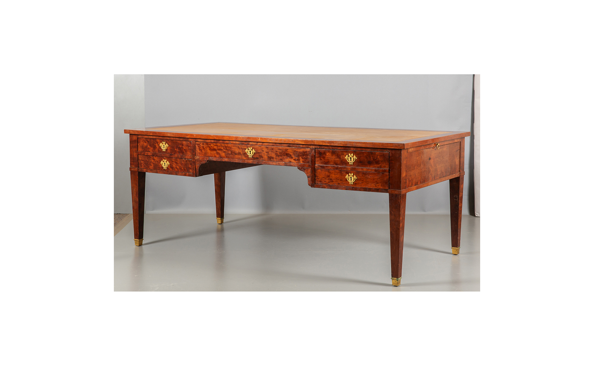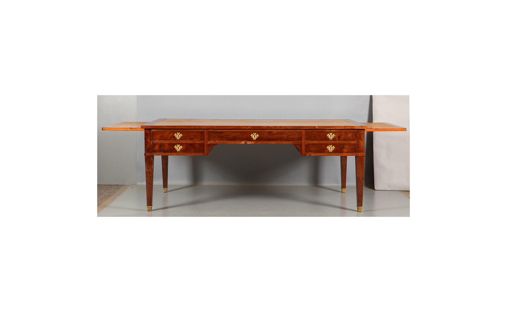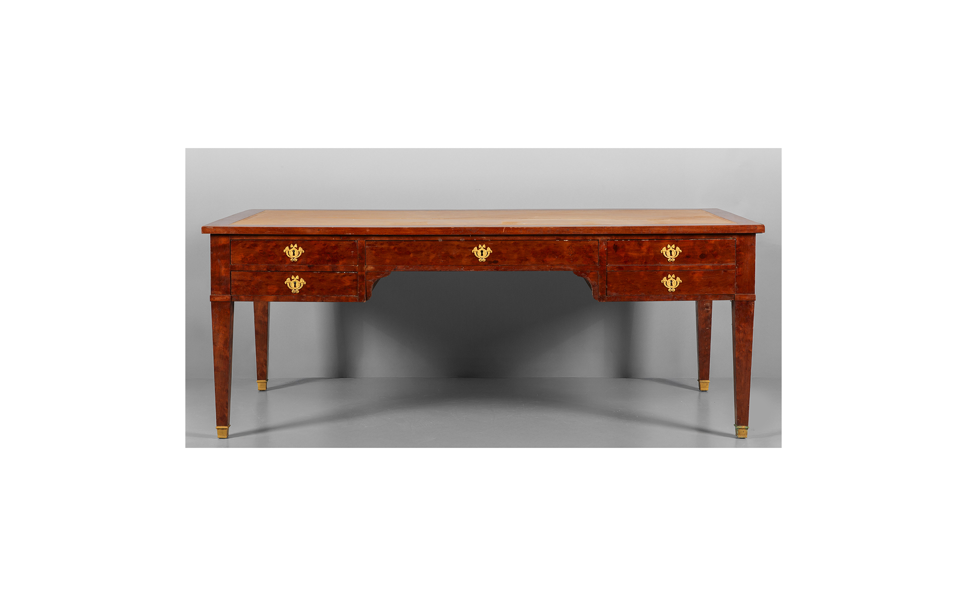 Grande diplomatica Impero lastronata in mogano cinque cassetti nella fascia due pianetti laterali piano in pelle sec.XIX