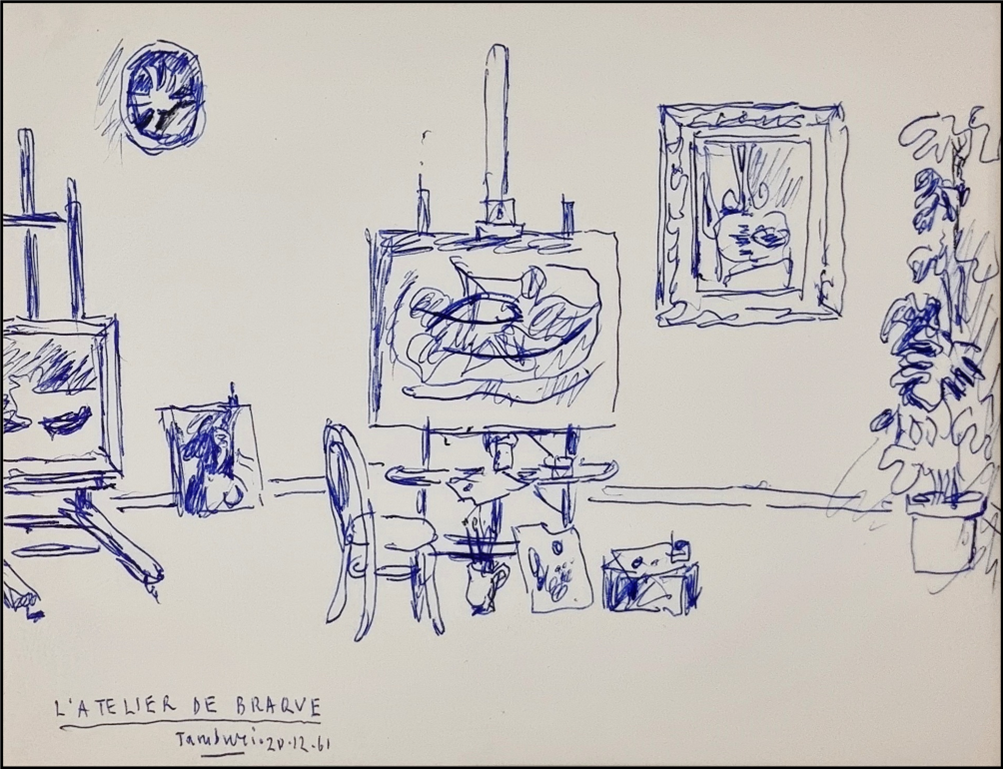 TAMBURI ORFEO Jesi 1910 - Parigi 1994 "L'atelier de braque" Penna su cartoncino cm 27x20 del 1961 corredata da passepartout. Intitolata, firmata e datata sul fronte in basso a sinistra. Autentica su foto a cura dell'Artista.