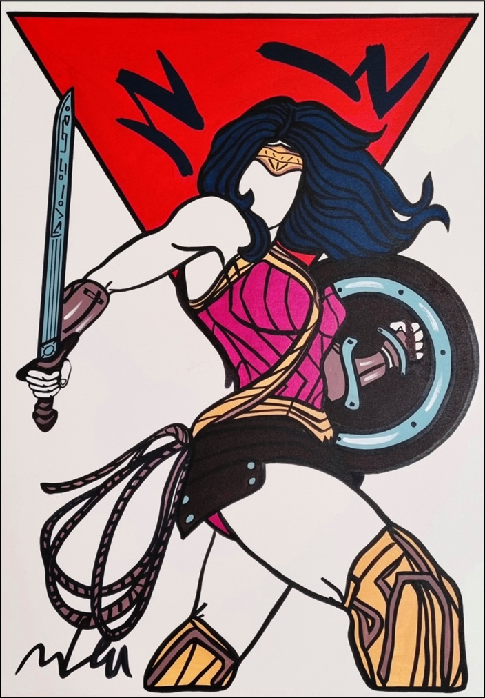 LODOLA MARCO Dorno 1955 "Wonder Woman" Acrilici su tela cm 70x100 del 2019. Firmata sul fronte in basso a sinistra e al verso. Archiviazione su foto a cura dell'Archivio Generale Marco Lodola.