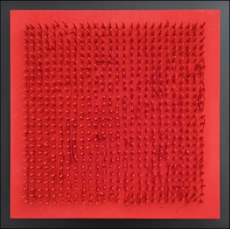 AUBERTIN BERNARD Francia 1934 - Germania 2015 "Tableau clous" Chiodi martellati su tavola cm 30x30 del 1970. Al retro data e firma. Opera archiviata a cura di Rovetta Giancarlo, pubblicata nel catalogo generale.
