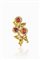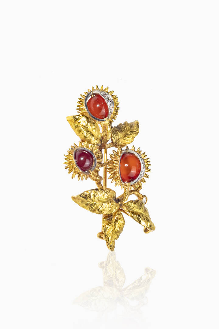 in oro giallo, a forma di ramo di castagne, con corniole e diamanti taglio brillante e 8/8 per totali ct 0,15 ca