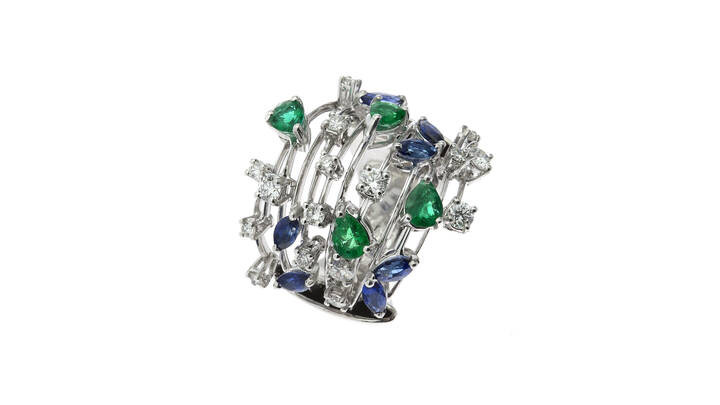 in oro bianco, sommità composta da fili su cui sono inseriti diamanti taglio brillante per totali ct 0,83 ca, zaffiri taglio ovale per totali ct 1,45 ca e smeraldi taglio a goccia per totali ct 1,15 ca