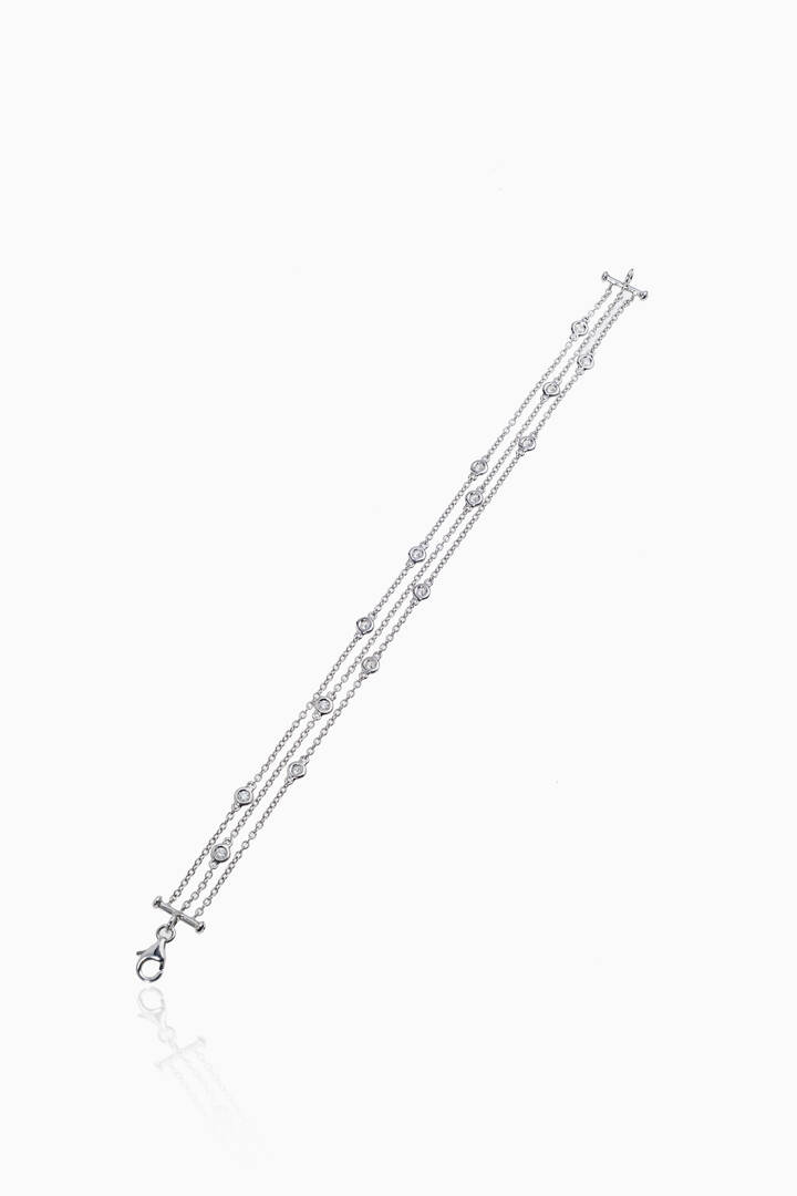 in oro bianco, composto da tre catene con diamanti taglio brillante per totali ct 0,42 ca, probabile colore G-H, purezza IF-VVS