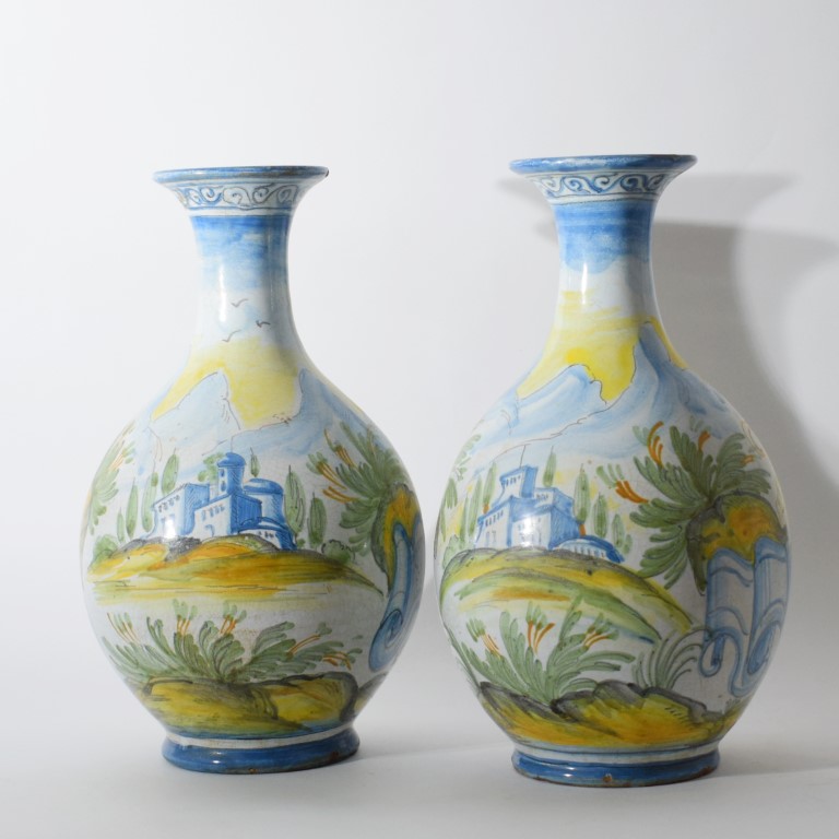 Coppia di bottiglie da farmacia in maiolica policroma