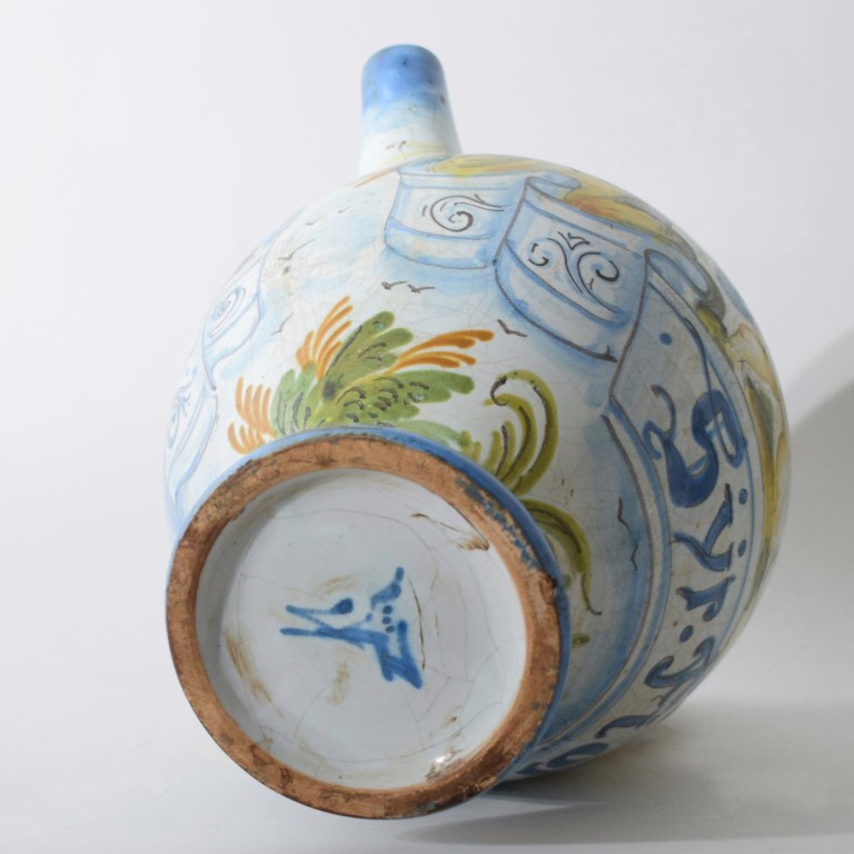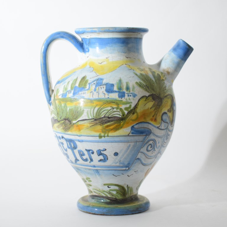In stile Settecento, con iscrizione, putto con cornucopia e paesaggio.