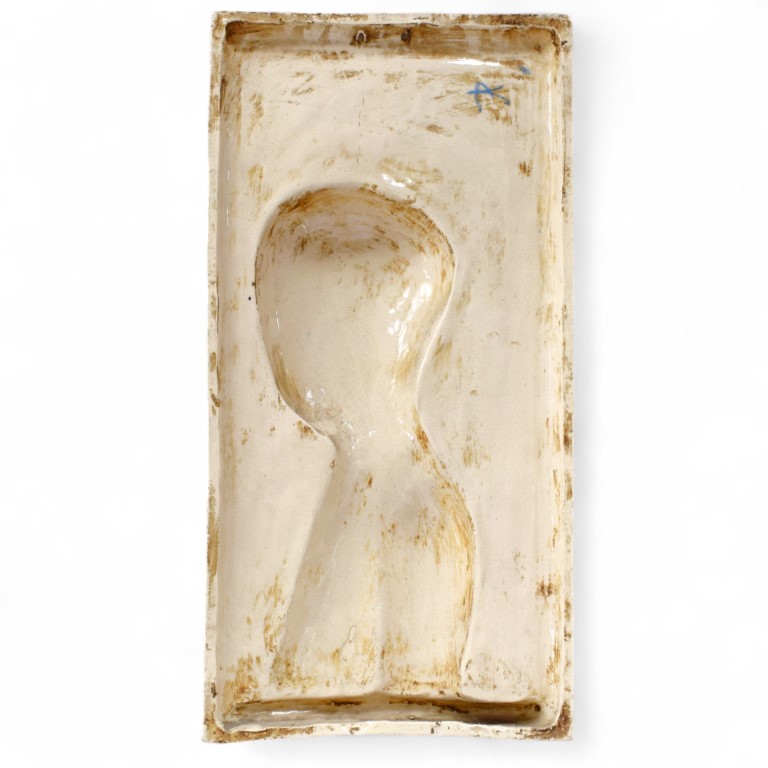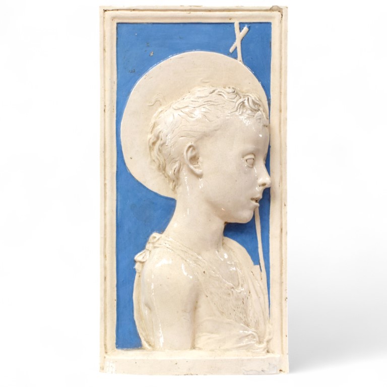 Grande pannello in maiolica policroma di stile robbiano dal modello di Desiderio da Settignano.
